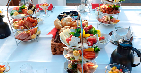 Wir laden Sie ein zu einem reichhaltigen Frühstück in der Morgensonne, einer Tasse Tee mit Kuchen am Nachmittag oder